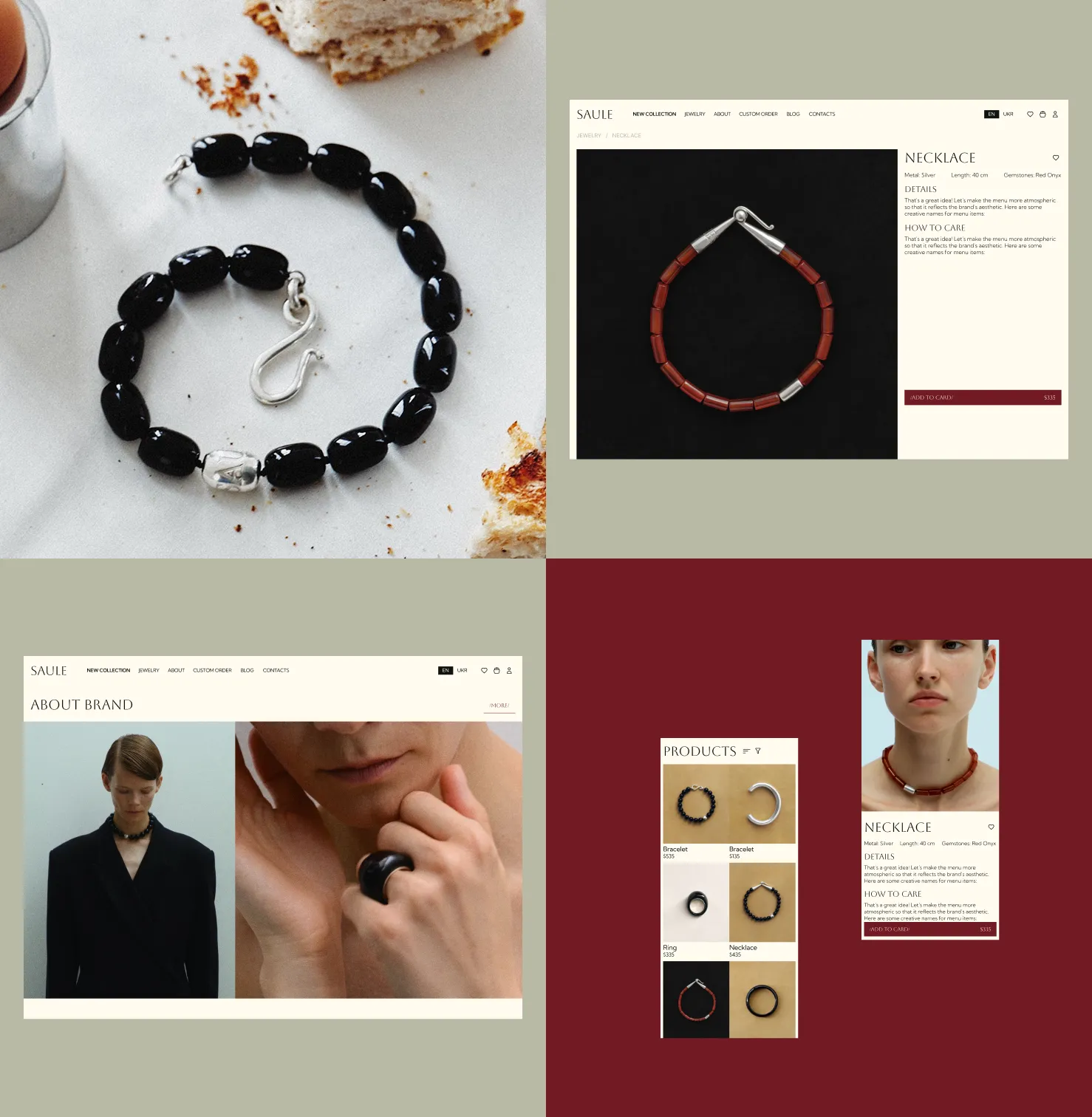 A refined and elegant website for Saule, a jewelry brand that blends natural gemstones, vintage elements, and timeless craftsmanship. The design focuses on storytelling, intuitive navigation, and a seamless custom order experience, allowing customers to create truly unique pieces.